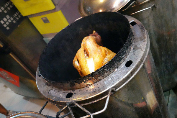 門口料理區有一排專為烤桶仔雞而設計的鐵桶,確保每隻雞能均勻受熱。