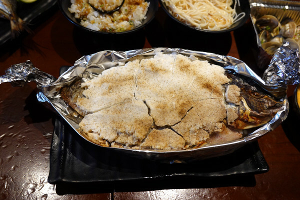 師傅將粗鹽均勻地抹在整條魚上,再用錫箔紙細心包裹,魚肉在火焰的熱力下被烤得香氣四溢。烤好之後,用敲擊粗鹽的方式把那層鹽殼輕輕敲開,瞬間釋放出鹽香混合著魚肉的自然鮮味。