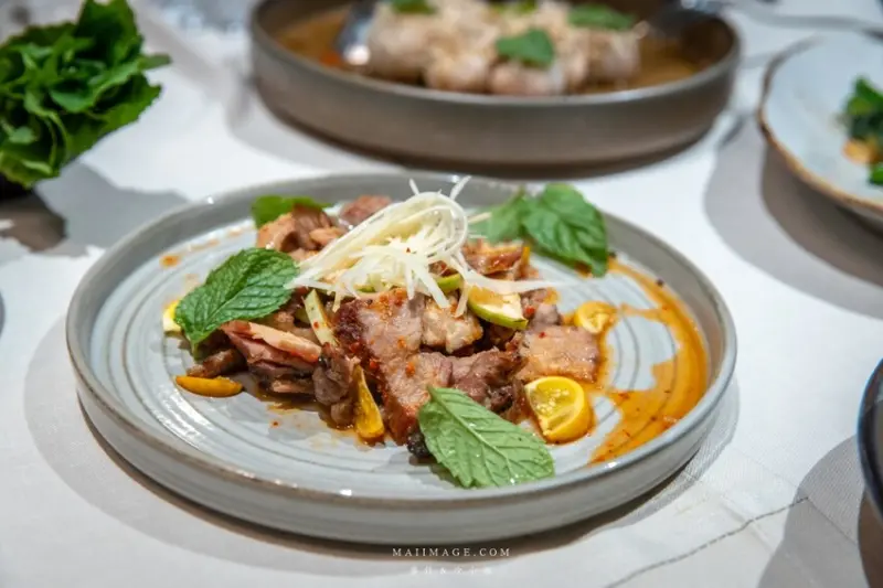 這道是泰式烤蝦醬配豬肉,有點冷盤料理的感覺,上面加上木瓜絲跟佐料口味也是很有特色。