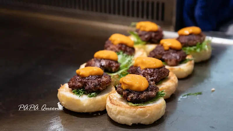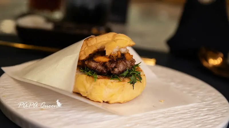 當天遇見這樣直接用和牛手拍漢堡肉煎表面焦黃後搭配生菜與特製蕃茄莎莎醬,醬汁呈現橘色有著細微辛辣透著蕃茄的酸,奶酥波蘿包本身就帶著奶香味直接烘托和牛堡的粗曠口感
