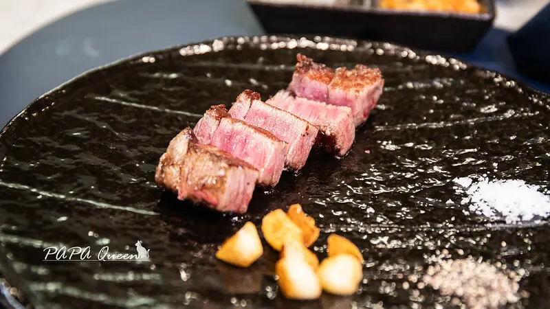 日本和牛登場,當天端出來的和牛油花真的是美瘋,還沒吃就開始期待著,建議先吃原味之後再搭蒜角、鹽之花、粗顆粒黑胡椒