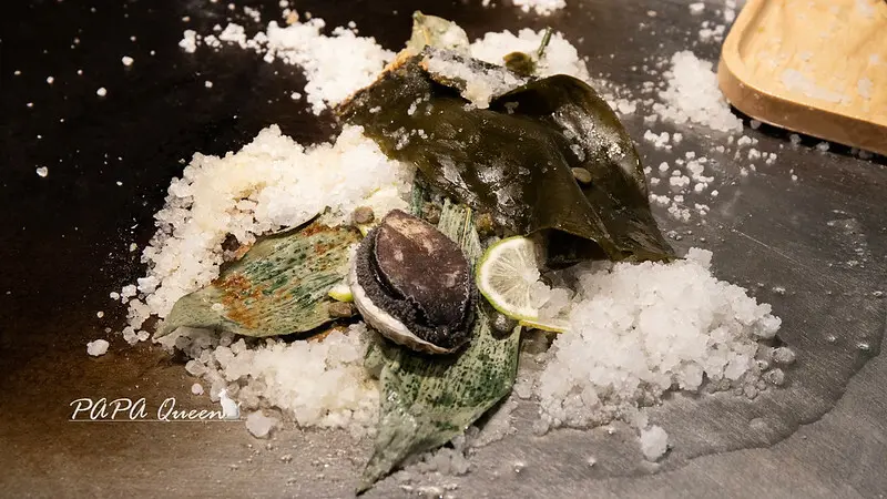 2400-鹽蒸鮑魚 (你贏了) 光是料理手法就好浮誇《鹽蒸》鮑魚-南非鮑魚上面覆蓋昆布和粗鹽以低溫熟成的方式入味!出爐後再搭配酸豆及萊姆使其更乳嫩!!