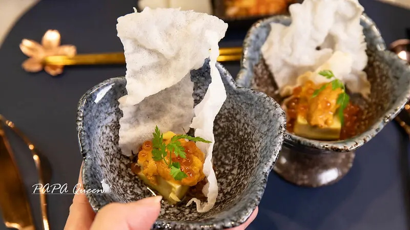 2400-北海道赤海膽,主角來自北海道的赤海膽,其本身味道就已足夠濃郁且鮮甜,更進一步搭配蟹黃豆腐增加風味之外更佐上鮭魚卵提高鮮味,白色我猜是炸米紙入口即化有著獨特甜味!