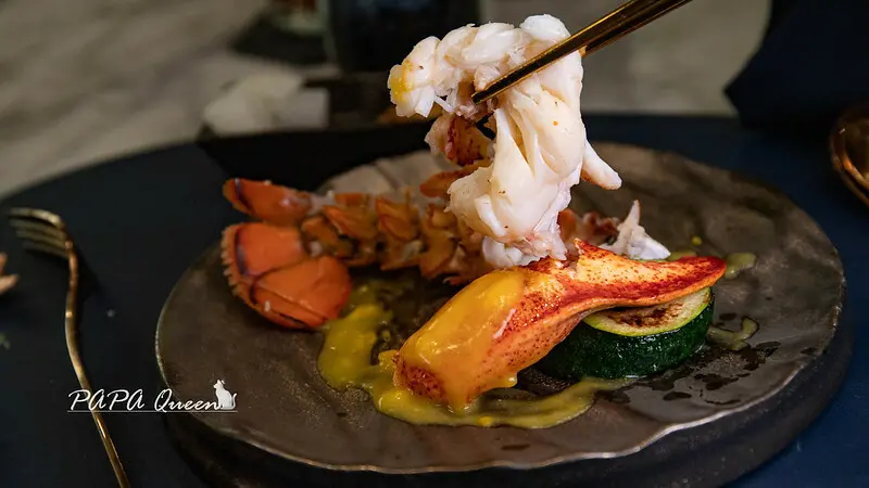 活跳跳龍蝦(連拍好幾張之後唯一穩穩趴在木盤清晰照)挑選波士頓龍蝦扎實口感又肥美,淋上南瓜醬,龍蝦肉鮮甜的程度必須自己品嘗才知道,建議先吃尾巴喔