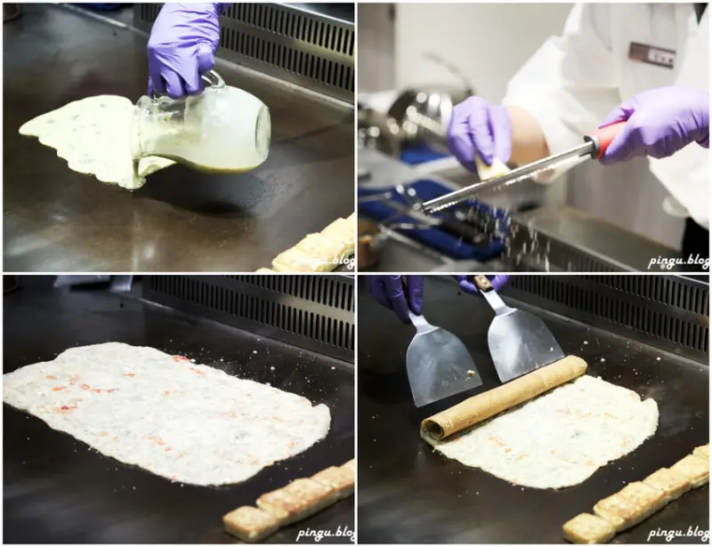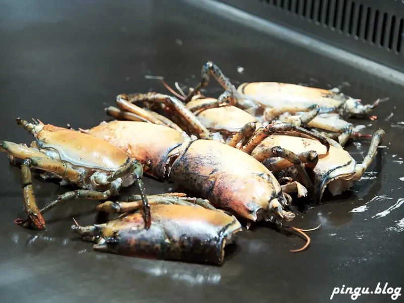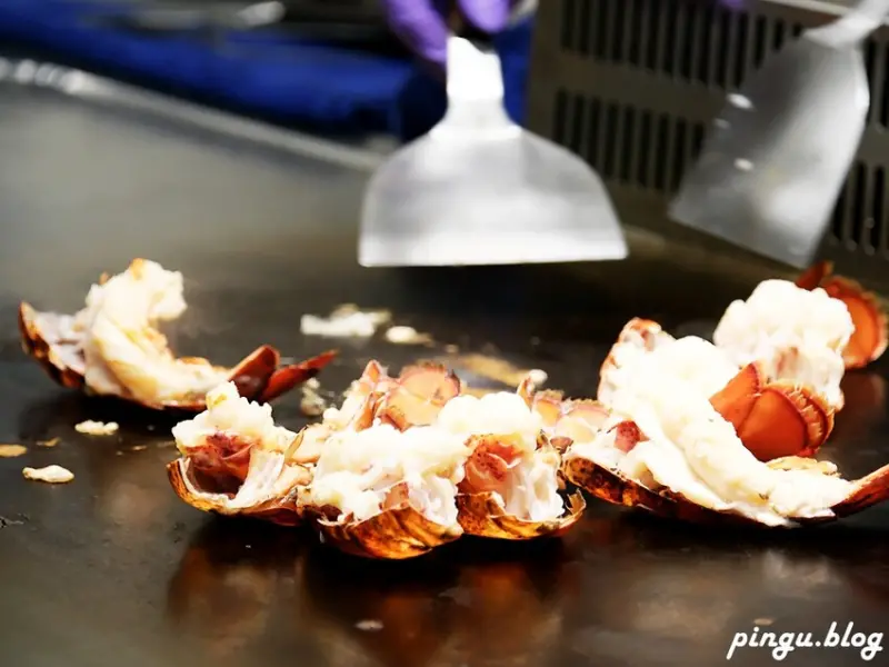 第一次看到這樣的鐵板燒料理,將蛋液加入龍蝦膏及鮮奶油調配後在鐵板上煎熟,再刨入帕碼森起士後捲起成為龍蝦膏芝心蛋捲~
