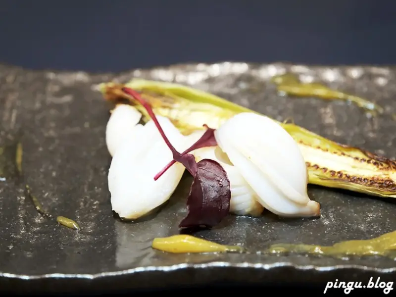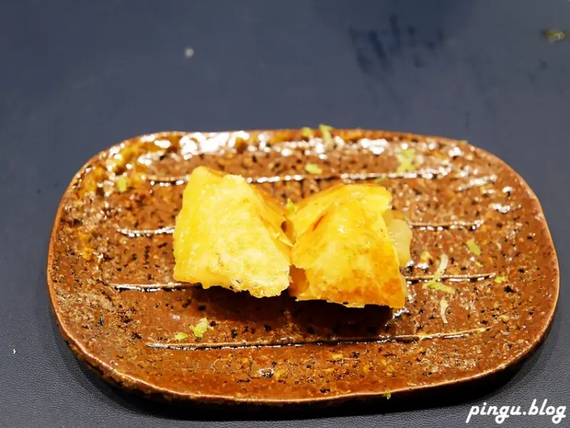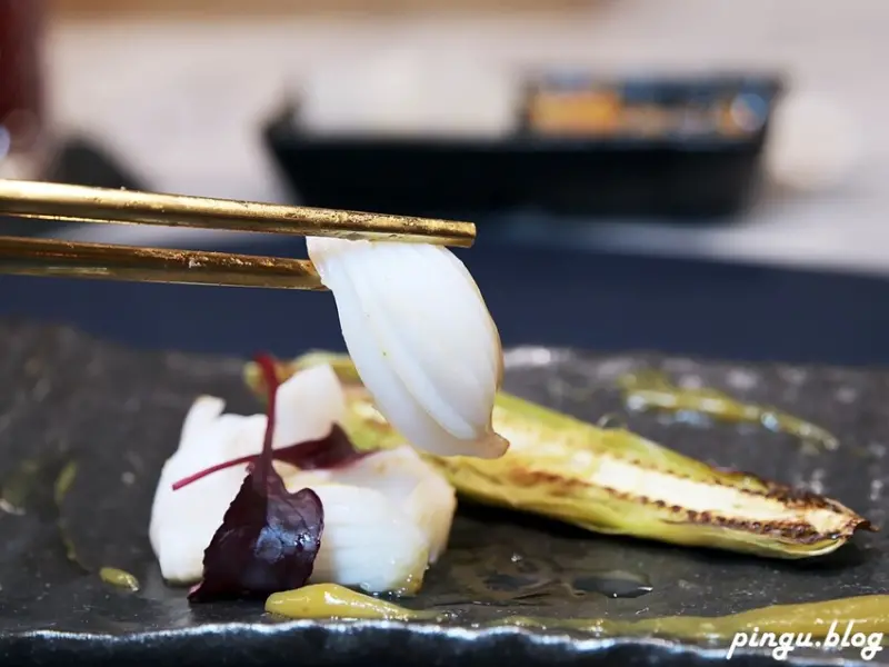 文甲就是經過精細日式刀工切紋向龜殼樣的花枝啦!!生食級花枝Q彈爽脆,淋上柚香味噌醬及撒上柚子香氣的胡椒,一整個果香四溢~