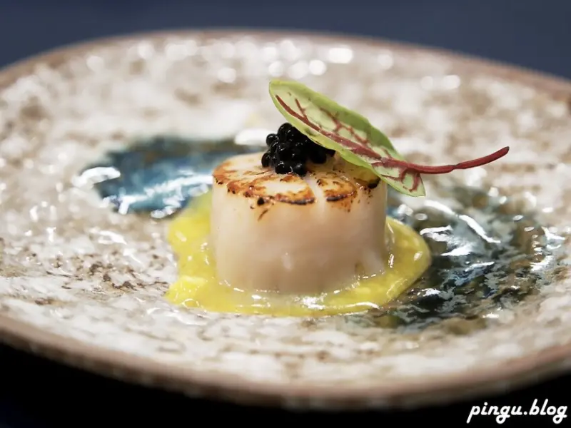 嚴選日本北海道生食等級干貝,兩面煎至金黃色外皮即可上桌,下方為用清酒手工熬製的金沙醬,上方搭配奢華的魚子醬,最後使用有機花草小牛血裝飾,5-7分熟的干貝吃起來彈牙鮮甜,