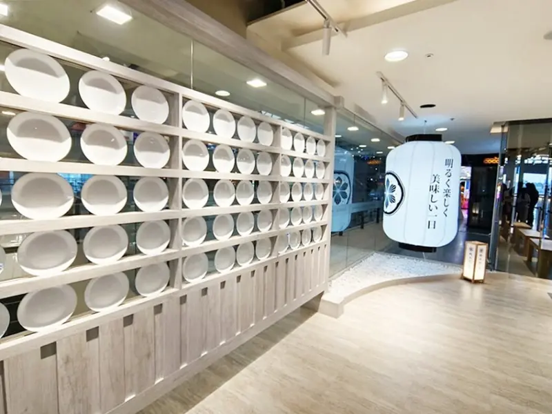 門口有整排的白色盤子裝飾的牆面超吸睛,一旁還有明水然·樂特色招牌的白色日式大燈籠,這絕對是IG必拍的打卡點啊!!