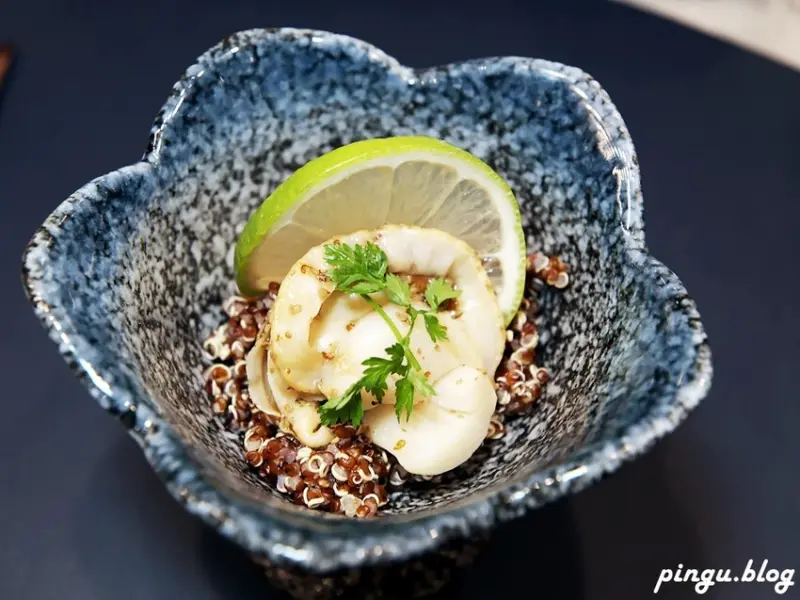 鮮嫩的帆立貝,完整保留鮮美貝柱、貝卵與貝唇,吃起來甘甜富有彈性,底層搭配營養滿分的藜麥,淋上檸檬汁很清爽~