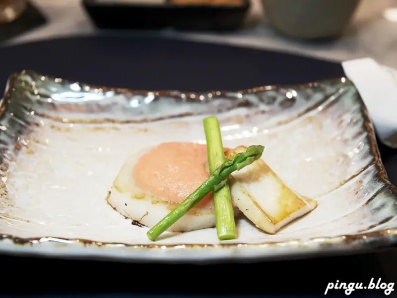 將日本山藥兩邊煎到金黃色外表,再搭配山藥泥及明太子製成的明太子慕斯,絲滑入口的口感,搭配蘆筍及杏鮑菇一起享用,很有層次感!!