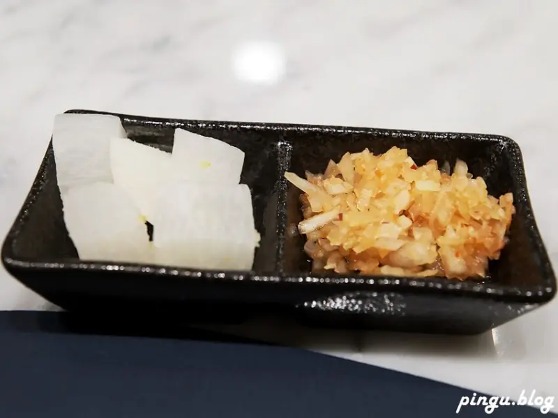 一入座後會送上兩種漬物,一種是「醋漬蘿蔔」將白蘿蔔用日本米醋醃漬,再加入紫蘇葉、柚子皮做提味,吃起來酸中帶著柚子香氣,另一種則是「蘋果洋蔥」,將洋蔥碎搭配蘋果、檸檬醬油及果醋調味,吃起來有著蘋果的脆口及酸甜的滋味,每一道都相當開胃,可搭配著主食享用~