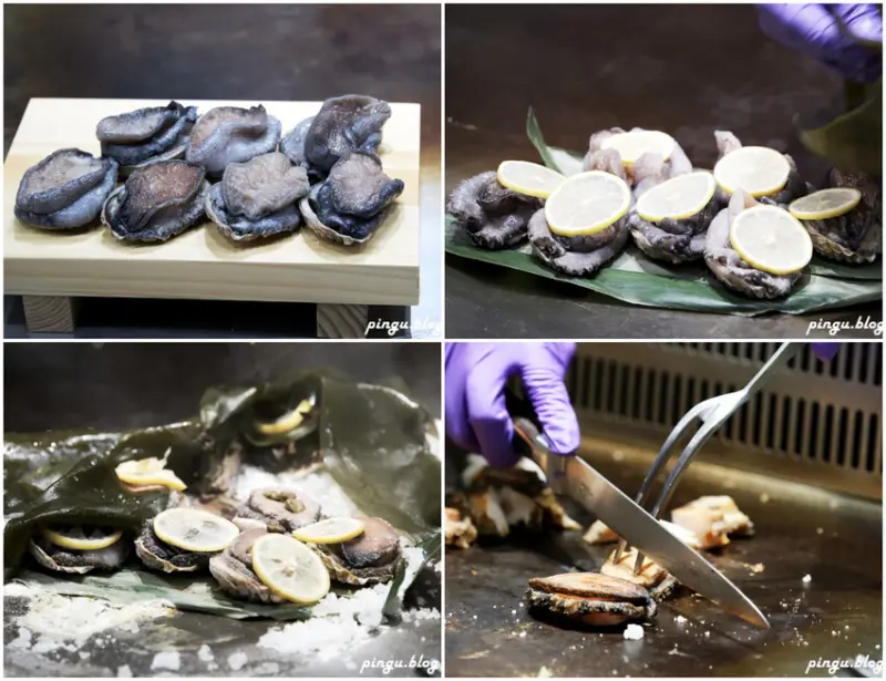 活跳跳的鮑魚就在眼前,一上鐵板就立刻縮起來好鮮活,來自南非的青鮑相當珍貴,需要8~10年才能算成熟,而料理方式採用特別的「鹽蒸」,在鮑魚上方加了酸豆及萊姆,並覆蓋昆布和粗鹽讓它慢慢低溫熟成~
