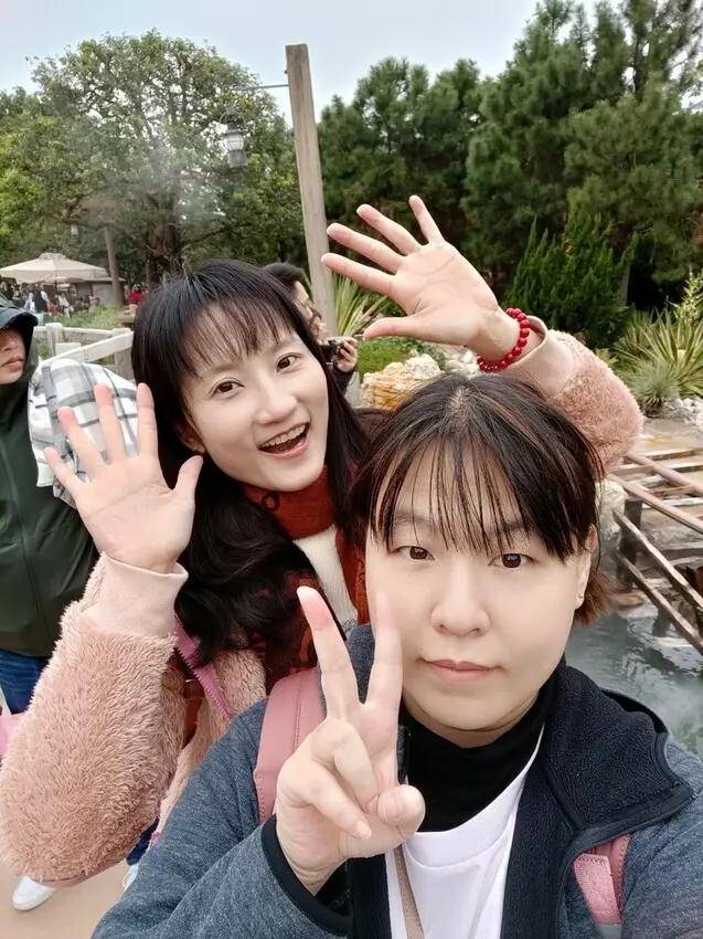 我們就是一旁的噴泉山谷邊照片邊迎接我們的富瑜姐姐路過
