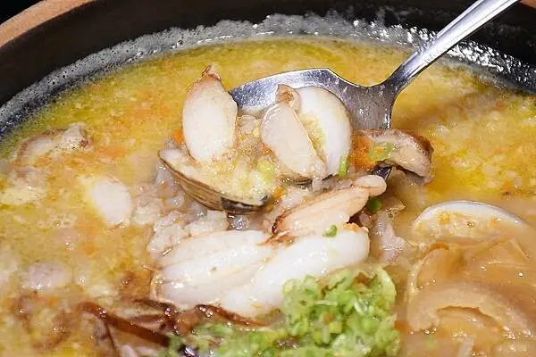 蛤蠣、蟹肉、蝦肉等新鮮的海鮮料增添了整鍋粥的鮮甜滋味,其中的鹹度是來自於鴨肉的味道,整鍋真的是難以言喻的鮮美