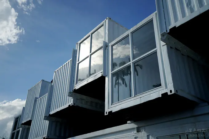 白色貨櫃屋在藍天白雲綠地襯托下還滿不錯看的