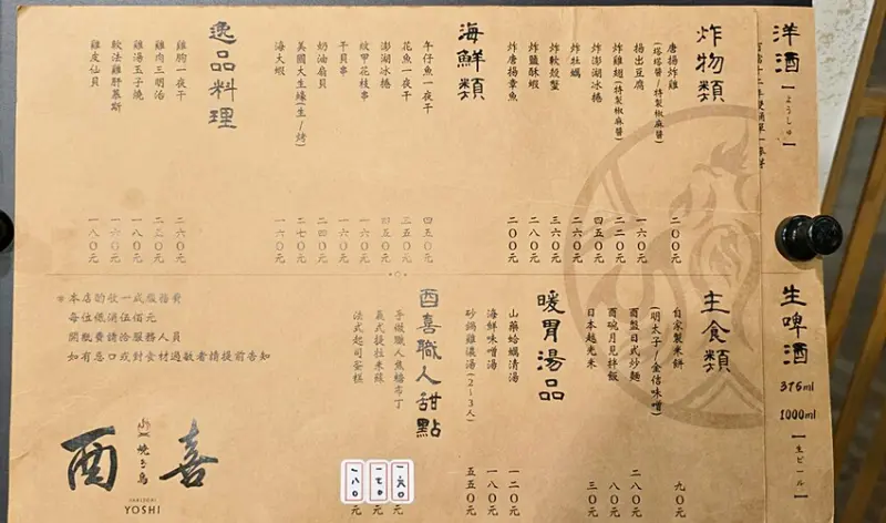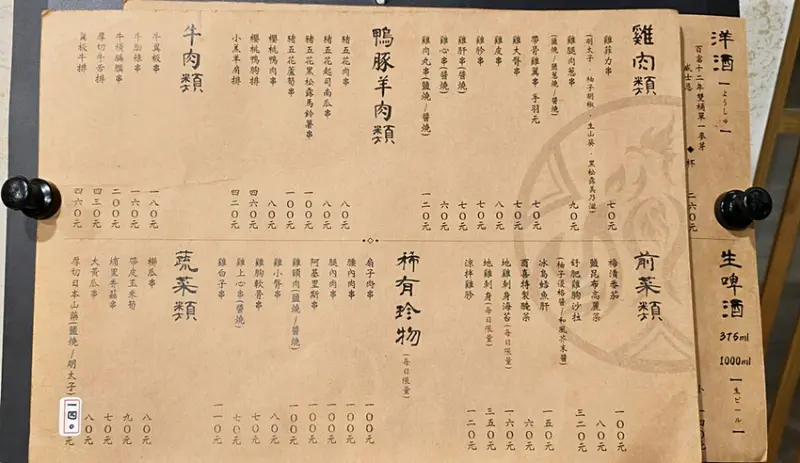 酉喜炭火燒鳥研製所菜單,店家以專賣天然地雞食材料理為主,所以小涼很推薦大家可以把雞肉類點一輪唷!!當然在依照自已喜歡來選擇鴨、豚、羊肉、牛肉或海鮮串燒,且這邊還特別規劃出稀有珍物區(限量),也就是串燒店很少看到的腰內肉串、扇子肉串、雞白子串等,吃串燒也少不了蔬菜類以及主食、炸物、湯品等,但最酷的是在居酒店也能吃到牛排、手作甜點等。就連家庭親子客群也都能來這輕鬆吃美食唷!!