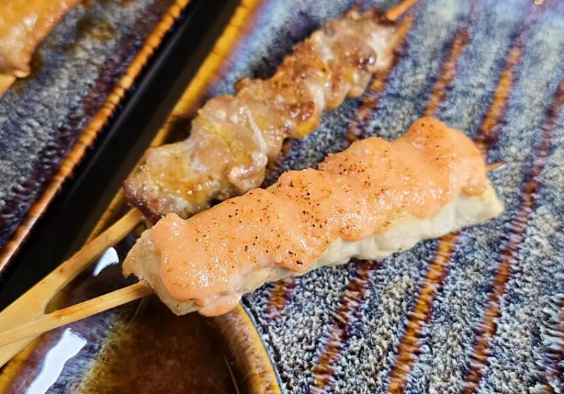 雞菲力串(明太子):厚實的雞菲力表面擠上不少明太子醬,炙燒過帶出香氣,建議趁熱吃能感受到明太子的濃厚香氣唷!一口咬入會先衝出明太子的鹹香,再來則是肉質的柔嫩呢~