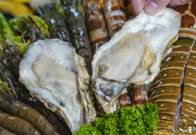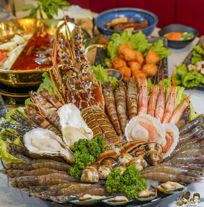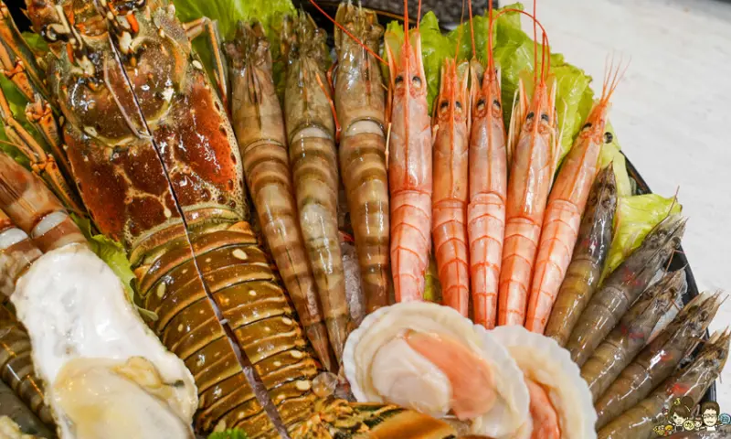 頂級巨無霸級大龍壓、數十隻各式彈牙大蝦、活釣蝦、大草蝦、海肥豬蝦、大白蝦、白蝦、鮮甜孔雀貝、深海大扇貝、蛤蠣、日本生蠔