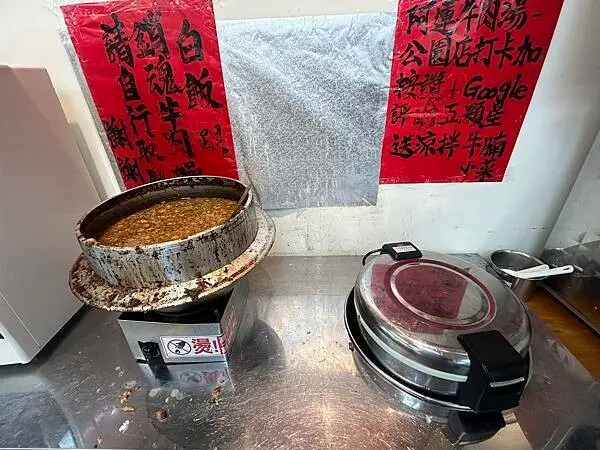 點了牛肉湯後,可以免費取用白飯或牛肉燥飯,自己盛到飽。牛肉燥飯的大鍋在自助區,看起來非常大方,隨時供應顧客。