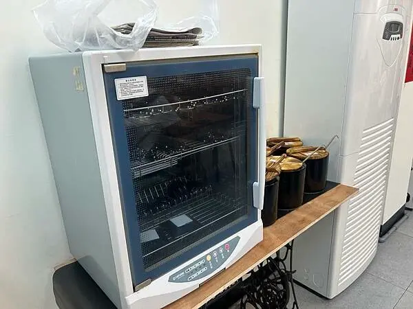 店內的餐具擺放在烘碗機中,保持乾淨衛生,顧客也可以自取使用。