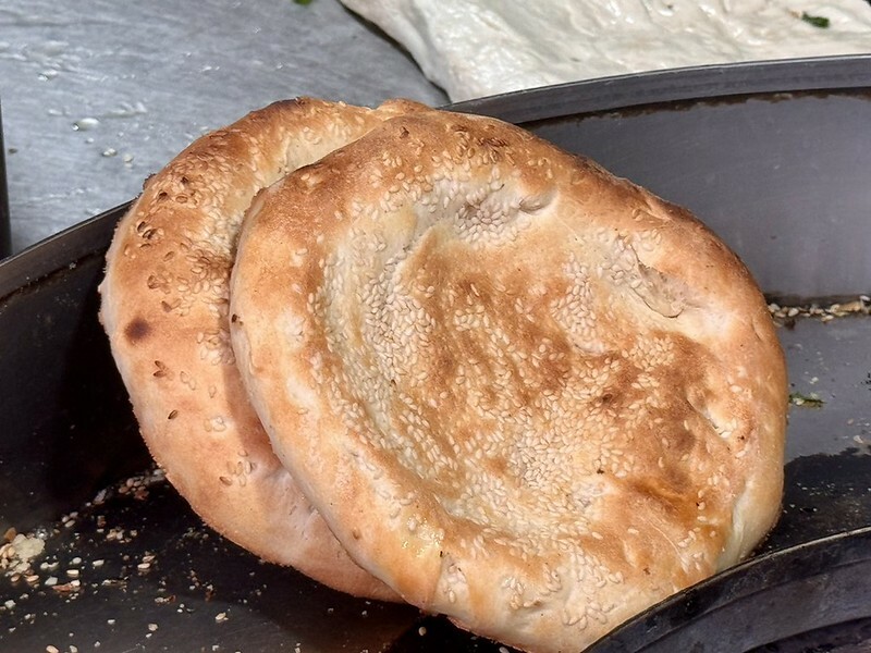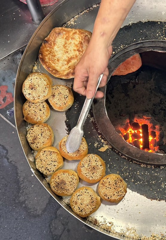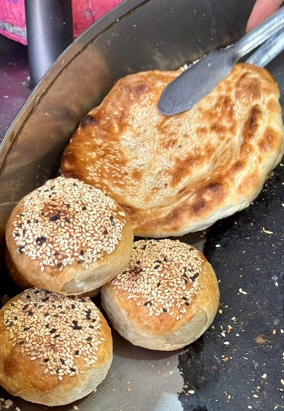 烤好的烤餅會放在爐邊保溫,等客人點餐後再刷上一層糖水重新加熱,這樣每一個到手的餅都是熱騰騰的。一口咬下去,外層香酥帶點微脆,裡面鬆軟中帶有空氣感,和我之前在中國吃過的烤饢完全不同,但這獨特的麵香真是讓人愛不釋口。如果不是後面還有其他攤位要吃,我當下應該會直接吃掉兩個。