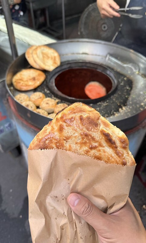 甜酥餅也是這裡的一大特色,和南機場夜市的甜酥餅相似,咬開時會有熱氣和糖的香氣,外層撒滿了香酥的芝麻,中間的麥芽糖餡雖然有些偏甜,但整體口感還是相當討喜。