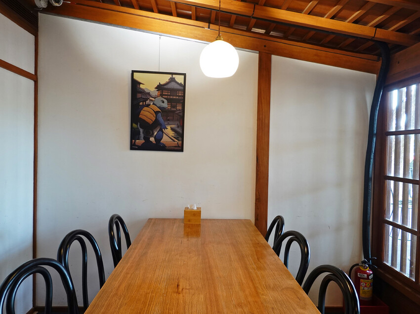 因此,在「新築窟」用餐時,你會被滿滿的木質復古日式風格包圍,同時腳下鋪設的洋式絨布地毯,為了維護老屋地板的原貌而精心設計。