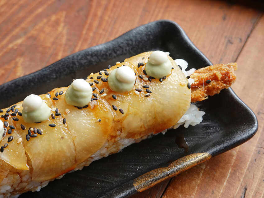 飯捲外層包覆柑橘千枚漬,並淋上薑汁照燒醬,再搭配芥末美乃滋、豆漿美乃滋及黑白芝麻點綴,不僅外觀美感十足,風味也非常豐富。酸甜的漬物與鹹甜的照燒醬相互平衡,而清爽的芥末與豆漿美乃滋讓整道料理毫無油膩感,巧妙地提升整體口感。