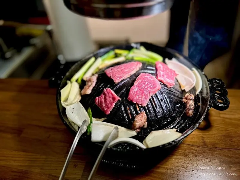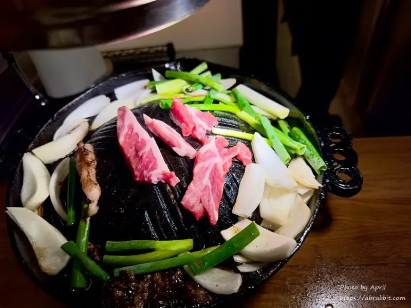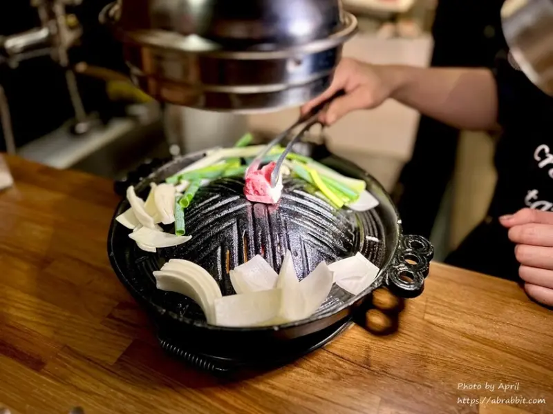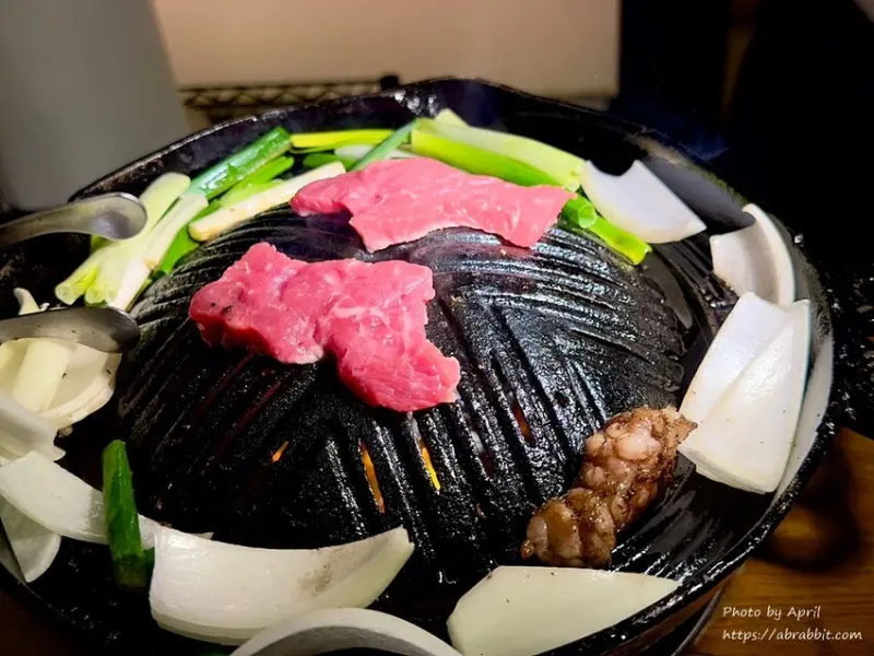 蔥段和洋蔥提供免費續加,可以將它們鋪在烤盤邊緣慢慢烤熟,搭配牛肉一起享用,風味更加迷人。