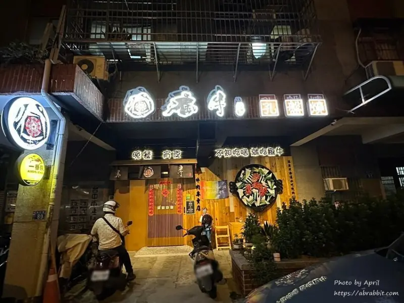 台中北區的「瘋牛孔盤燒」坐落於健行路上,外觀採用低調的木頭色系設計,晚上不容易被發現,旁邊是洪文記涼麵涼皮專賣店。
