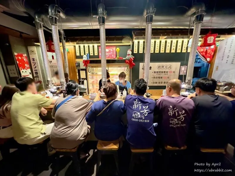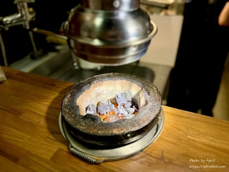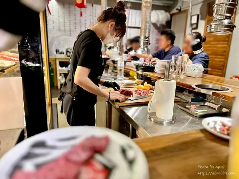 兩人共用一個炭火烤盤,搭配抽油煙管與燈光,雖是燒烤環境但完全沒有濃重油煙味。在吧台區還能近距離看美女老闆專業切肉,別有一番樂趣。