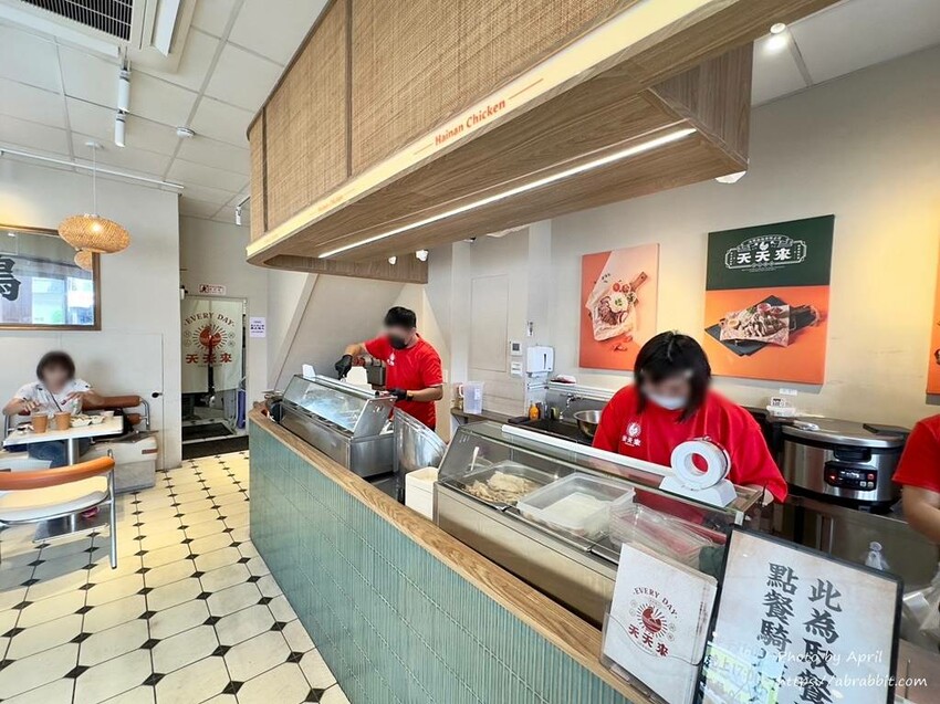 天天來海南雞的外觀設計非常引人注目,白底紅字的復古招牌格外顯眼。店內外都有座位區,但當天人潮很多,幾乎全場爆滿,需要稍微等候一下才能入座。