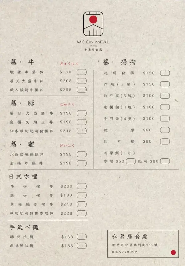 餐點選擇豐富,包括日式丼飯、咖哩飯、串燒、拉麵等,且全天候供應,適合在新竹城隍廟逛街後來這裡享受美食。結帳都是現金付款,另外「和慕居食處」也上架了美食外送平台,想外帶回家也很方便。![]()