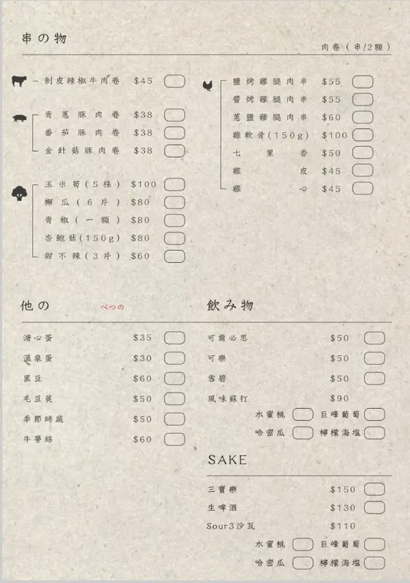 番茄豚肉串最後強推「番茄豚肉串」,豬肉包裹著飽滿多汁的番茄,咬下去能同時感受到番茄的清甜與豬肉的鮮美,吃完會忍不住再來一串!非常適合下酒或是當作小點心,非常解饞。![]()