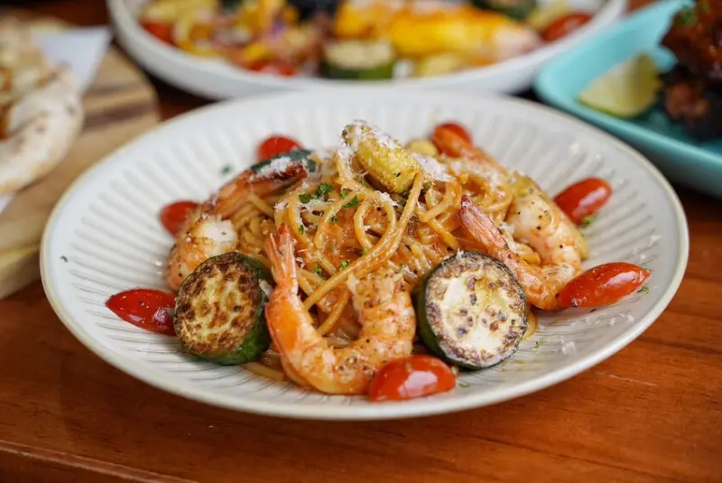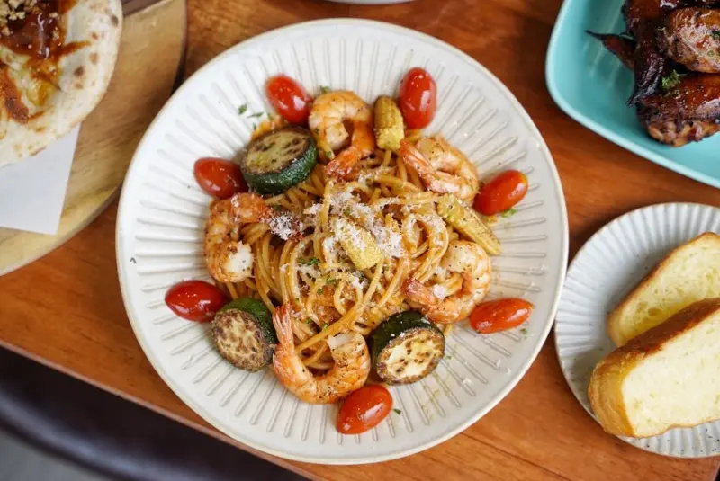 「濃濃蝦味鮮蝦義大利麵」幾乎是桌桌必點!加入大量蝦頭下去熬煮的蝦油,與辣椒、蒜頭下去拌炒,吃起來就是名副其實的濃濃蝦味!還幫你去好蝦殼,超貼心,肉質非常脆甜好吃,一旁還有水嫩多汁的櫛瓜,麵條口感軟硬度適中,吸附滿滿醬汁,真的超開胃~