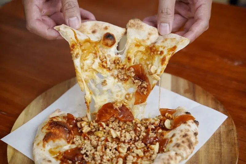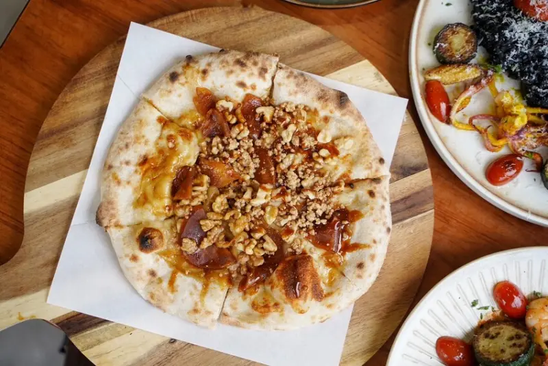 闆娘推薦的「肉桂焦糖蘋果Pizza」真的讓我們很驚艷!是款手拍薄皮Pizza,焦糖蘋果與起司完美融合,鹹鹹甜甜的滋味真的很對味,上頭還有核桃、肉桂酥粒來增添口感及香氣,沒想到甜Pizza也可以這麼厲害,重點是這道冷掉也很好吃!