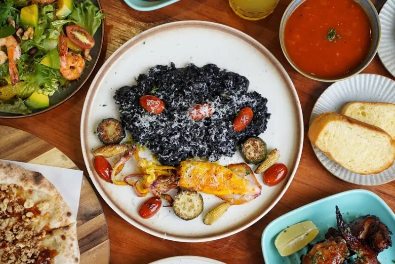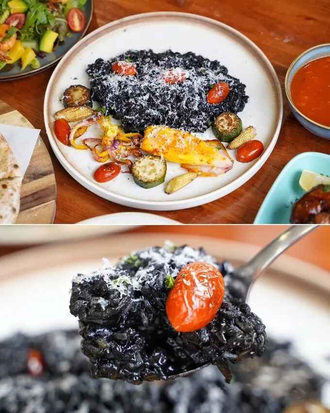 黝黑的「墨魚燉飯」上桌前還會刨上起司,看起來更誘人!這黑色的墨魚汁可是老闆從新鮮墨魚身上手擠出來的,難怪燉飯超鮮甜而且毫無腥味,米心可選擇硬度,這點超加分,一旁還有煎至焦香的櫛瓜,還有以薑黃來調味的新鮮小卷,這道為每日限量燉飯,售完為止。