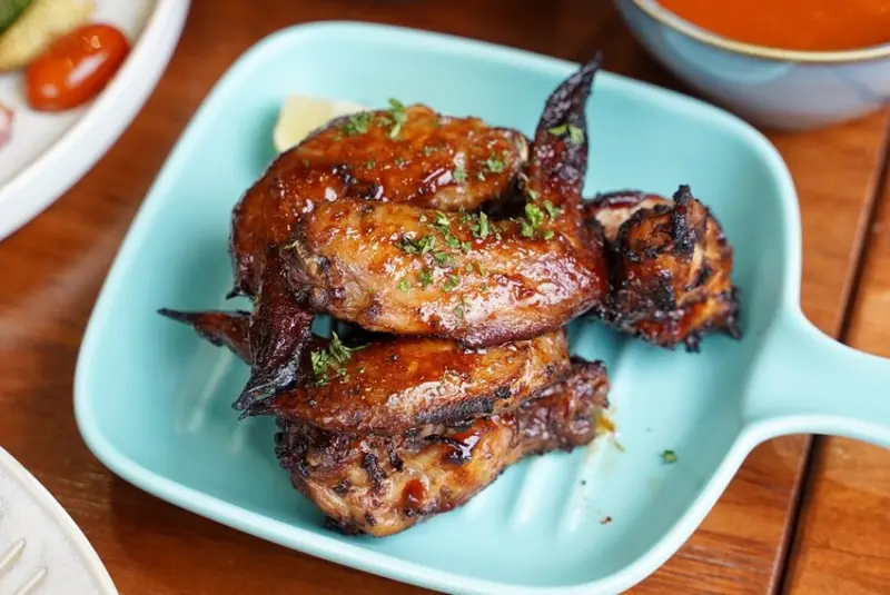 「爐烤BBQ雞翅」烤至油油亮亮的金黃色澤,真的超誘人,吃起來是甜甜的韓式醬料滋味,包含棒腿、雞翅各三隻,很適合點一份大家分享。