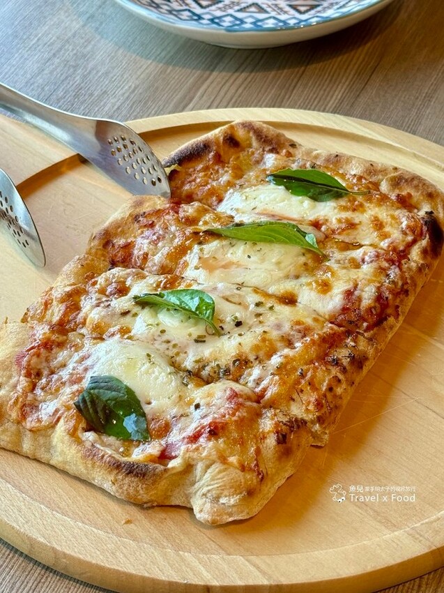 家人也有一份跟我們相同的套餐,特選料理三選一選擇了「瑪格莉特披薩」,厚薄度適中,上層口感軟綿,手推餅皮略有嚼勁,長長的造型更容易分食,也能讓披薩的配料更為平均,以整塊原木入窯燻烤出木質調的香氣,令人大塊朵頤。