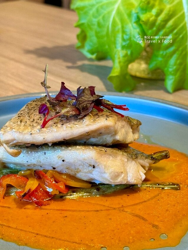 經典主餐三選二「窯烤鱸魚配印式辣茄醬」,厚切魚肉新鮮綿密,簡單搭配少許蔬菜,彷彿畫作一般端上桌,其豐盛度與豬腳不相上下,一魚一豬無從比較,各有其所好。此道有辣,長輩孩童請慎用。
