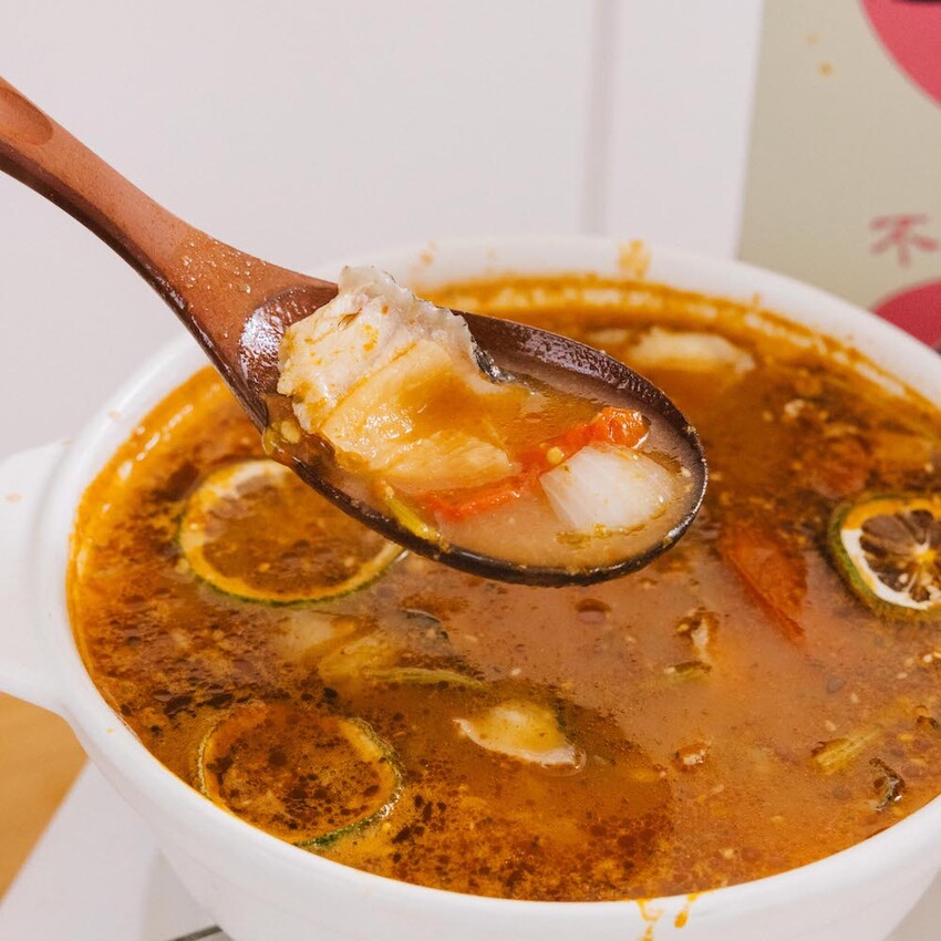 真材實料番茄酸菜魚湯包,番茄、芹菜等都看得見