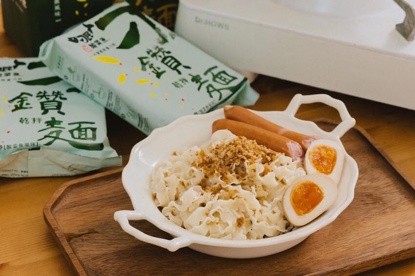 波浪麵條水滾五分鐘,瀝乾後加入醬包以及油包
