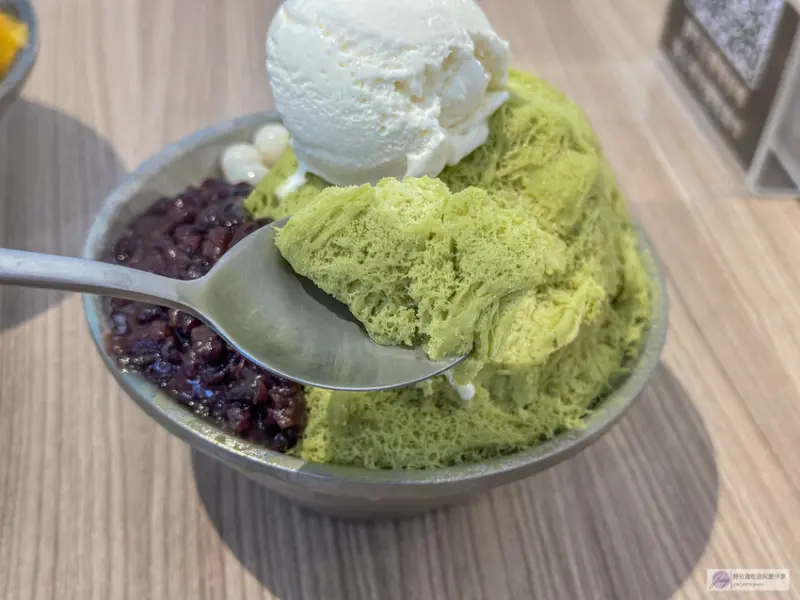 身為抹茶控的我,當然不能錯過宇治金時雪花冰!這份雪花冰中有紅豆、湯圓、抹茶雪花冰和香草冰淇淋,抹茶的味道屬於清香類型,不會過於苦澀。紅豆泥綿密、甜度剛好,搭配清爽的抹茶雪花冰非常合適,旁邊的小湯圓Q彈可口,雖然我個人更喜歡白玉的軟Q口感,但整體還是非常滿意。上面再放上一顆香草冰淇淋,真的是絕配!