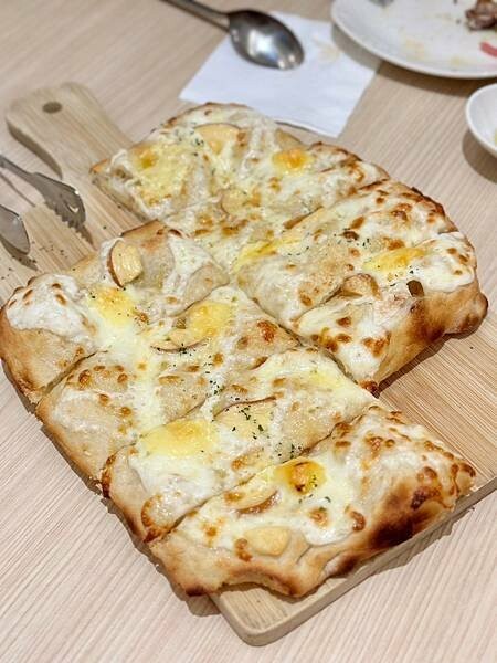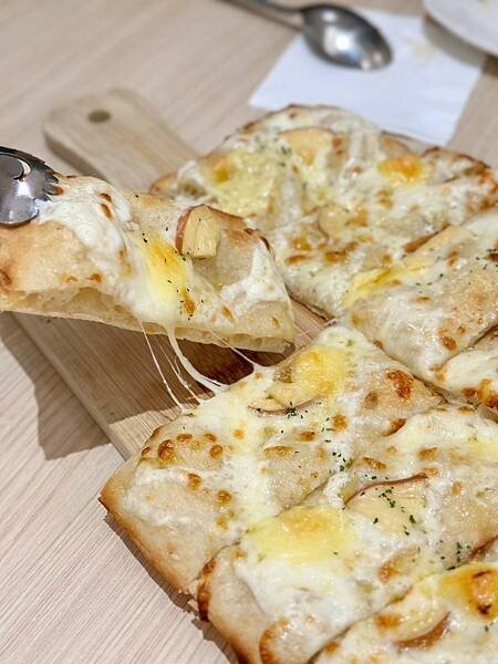 薄脆的羅馬披薩餅皮上鋪滿馬自瑞拉、帕達諾、煙燻與高達起司。