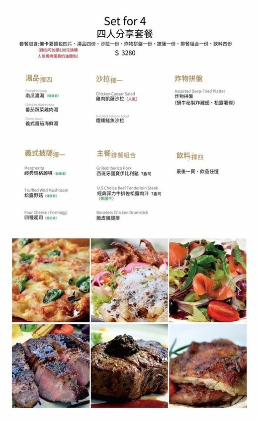以下是我們品嚐的四人分享餐,內含佛卡夏麵包、沙拉、湯品、炸物、披薩、排餐及飲品,份量充足且滋味驚艷。