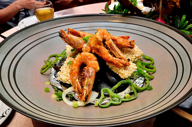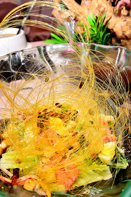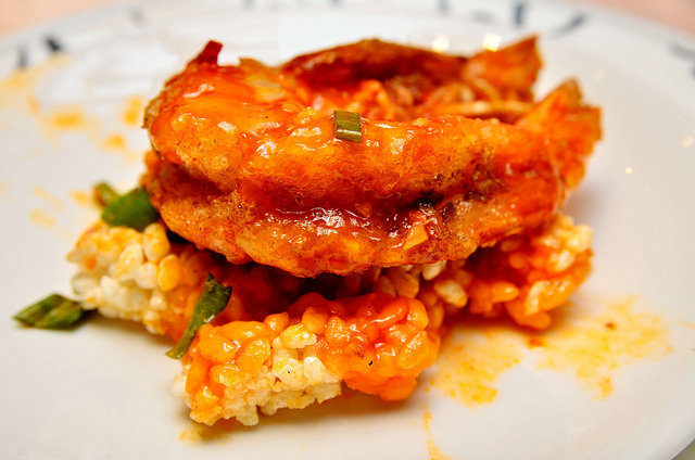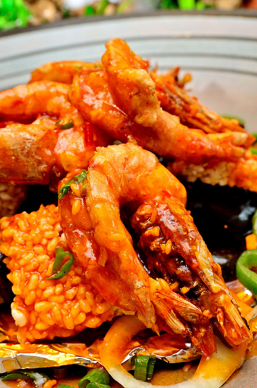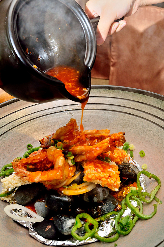鍋巴明蝦,下頭放的是炙熱的石頭