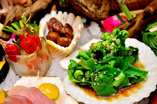 藝術插花來著,冰山上擺著各式各樣的生鮮海產,山珍海味