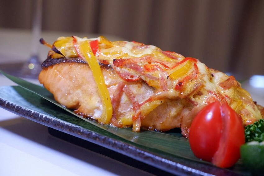 超厚的鮭魚上堆滿了彩色青椒
