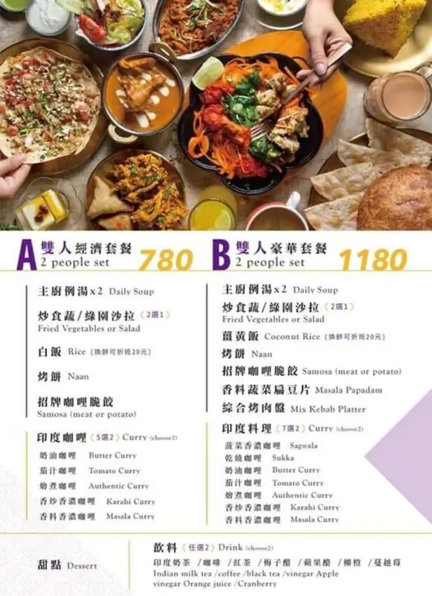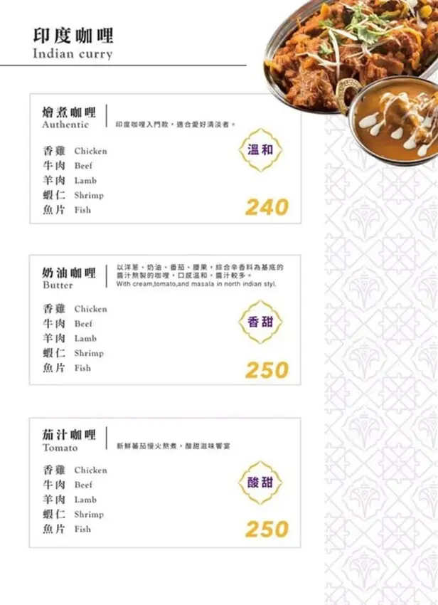 - 印度咖哩-蔬菜香濃咖哩/乾燒咖哩/奶油咖哩/茄汁咖哩/燴煮咖哩/香炒香濃咖哩/香料香濃咖哩(7擇2),可選牛羊雞或海鮮