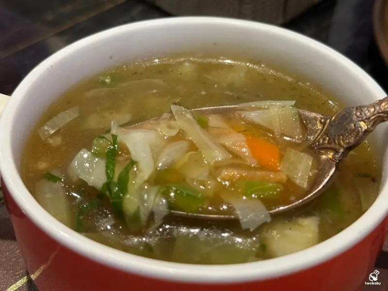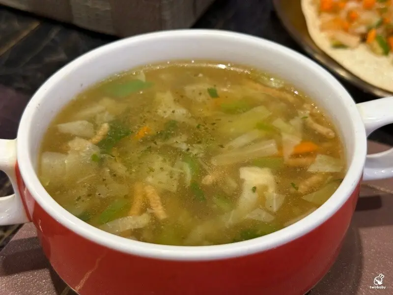 今天例湯是蔬菜湯,細細一條一條的是炸義大利麵條~